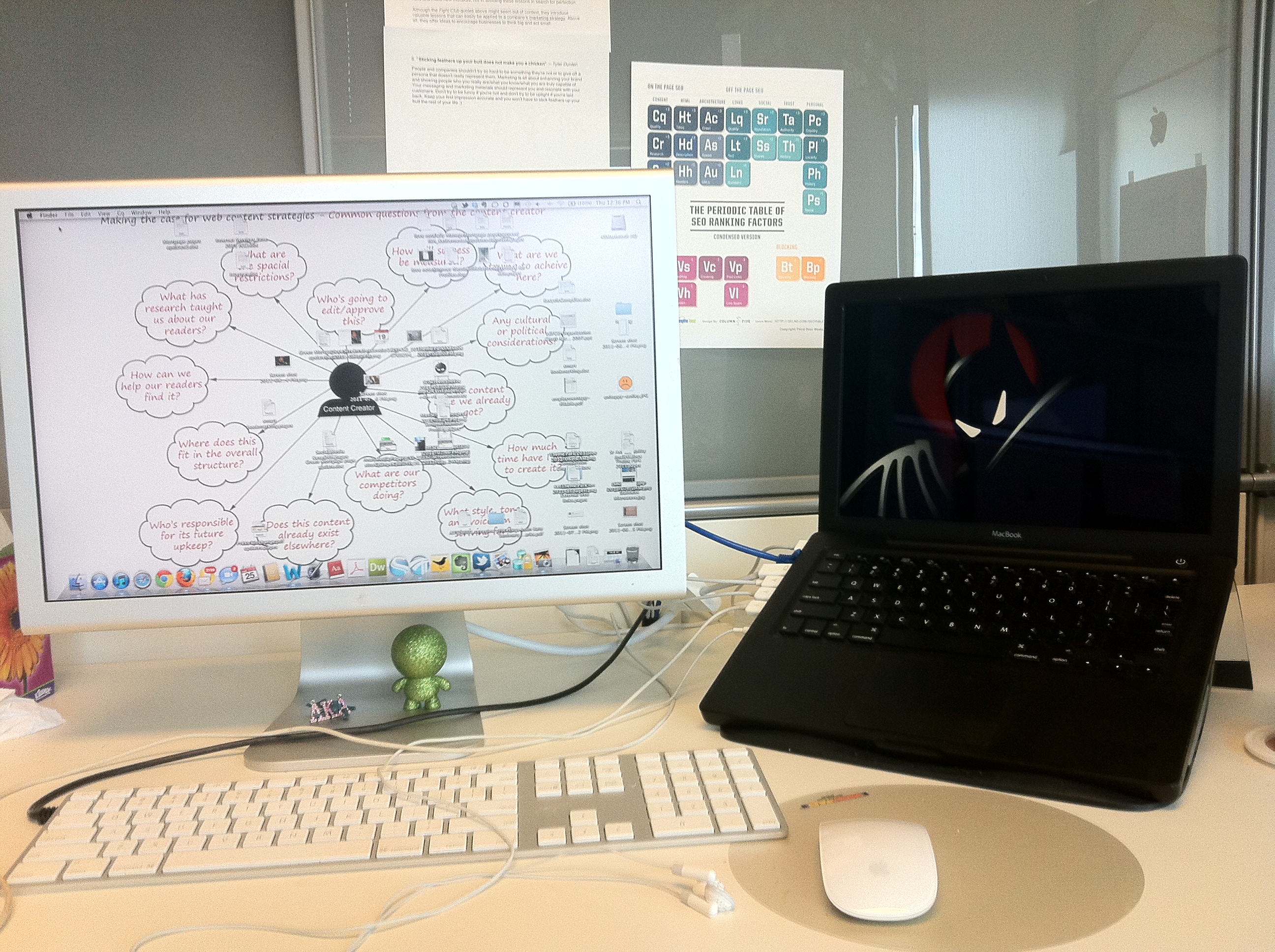 such as earbuds and cables). In addition to my Apple products, at work I use a black MacBook, Magic Mouse, keyboard and an old silver Apple monitor. I’ve even branded the Dell printer as an Apple thanks to the generous amounts of stickers they provide every time you make a purchase. I have never strayed. I’ve always owned a Mac–even when I had to really scrape together my last bits of money to buy such an expensive machine even when it was pre-owned. The first one I bought was the Macintosh LC 550. Then I got a Power Macintosh 6500. And then my first laptop–a Powerbook. Feeling the power of portability, I can’t imagine buying another desktop. My next Mac was an iBook and now a MacBook. Joining the computer family came the iPod Shuffle, iPod Touch, iPhone 4, and Apple TV. After getting hooked on wireless following the 2nd generation Airport base station purchase, I continued with Airport Express and Airport Extreme. The iPad Classic (as I call it) was won in a drawing at work. Lucky, lucky me!