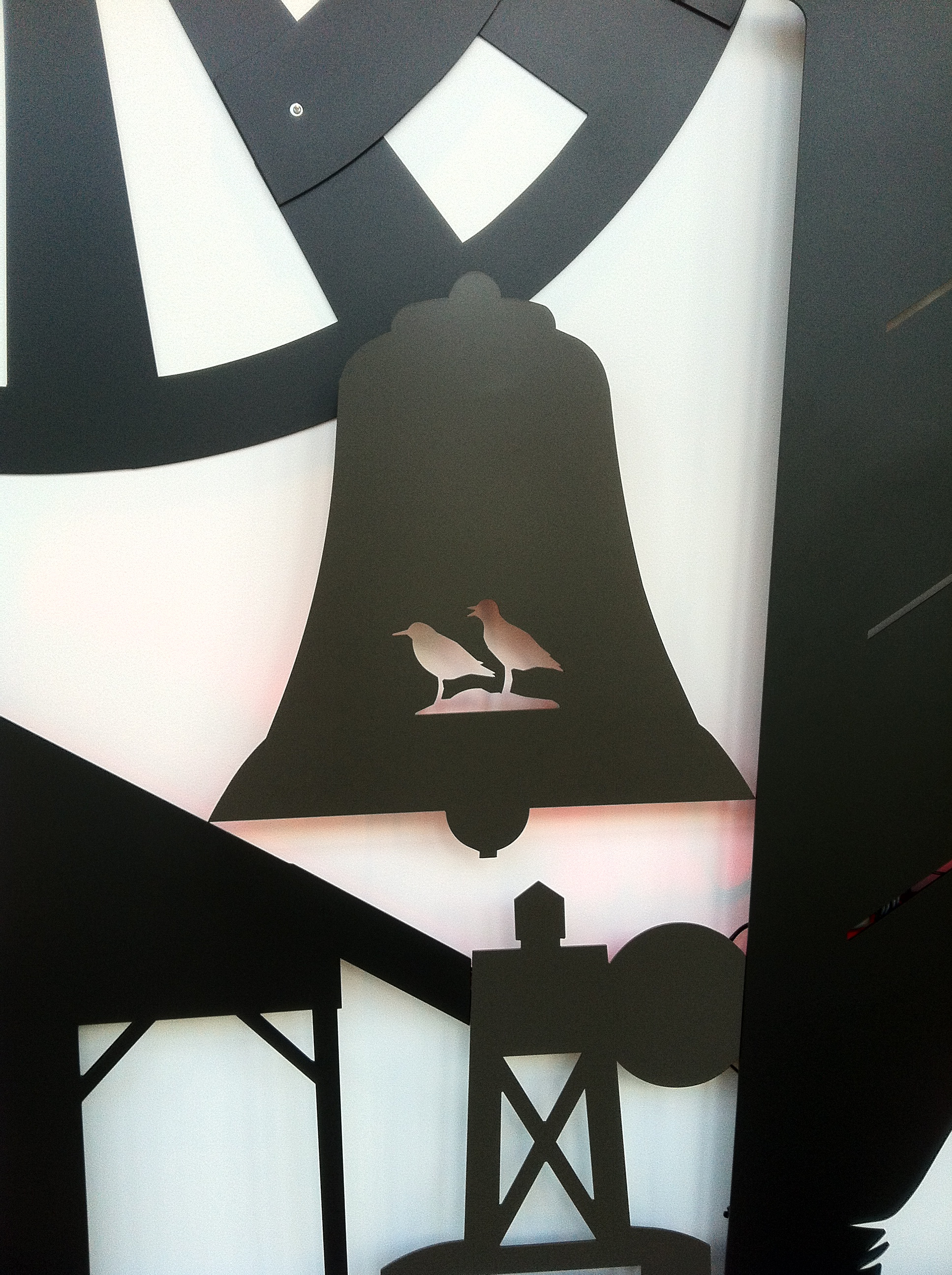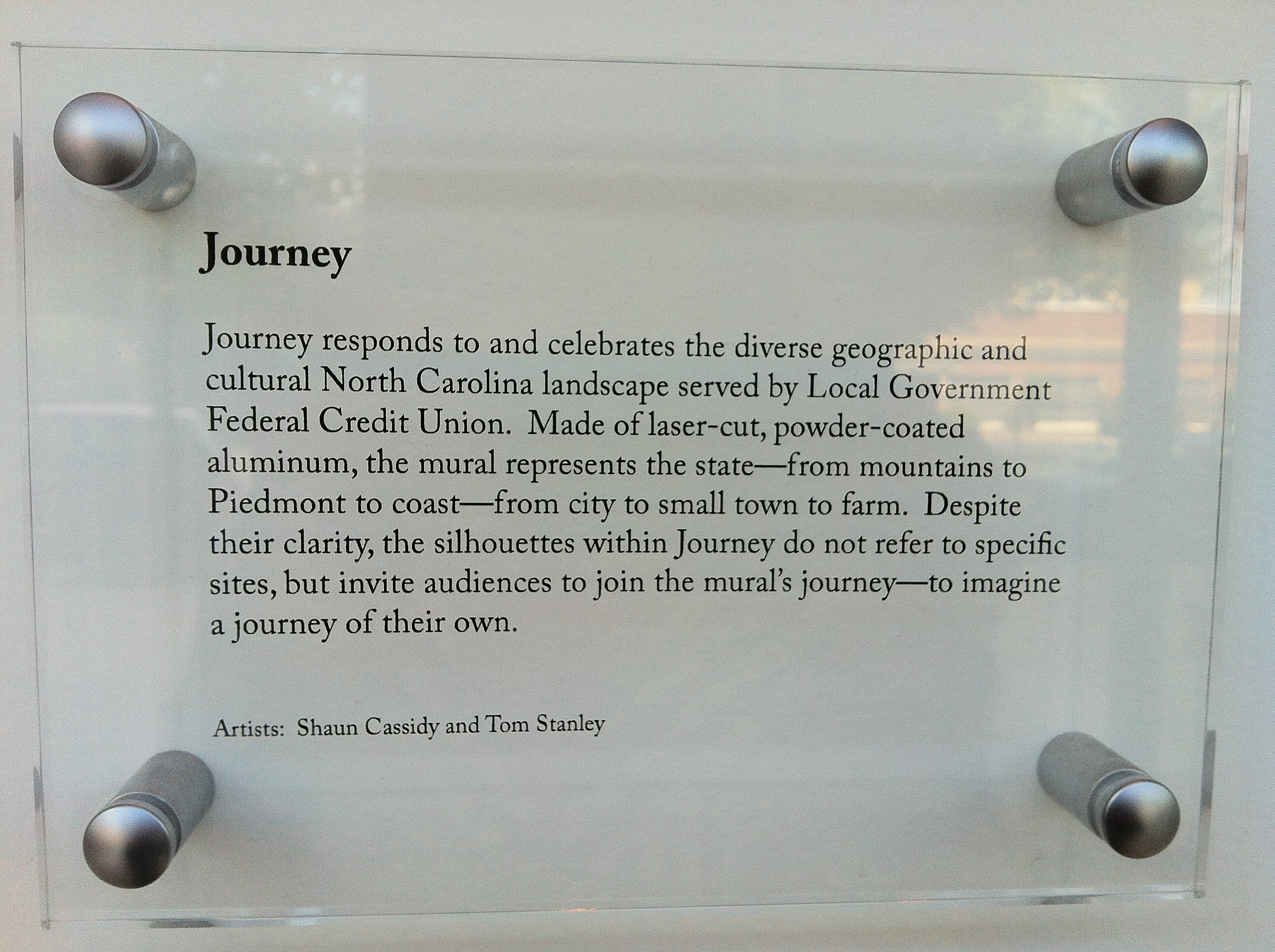 The title of this original artwork is Journey. It’s pretty large so it was hard to capture with just my lil ole iPhone. Basically the piece features iconic images of things you’d see as you journey across North Carolina. At night, it’s even nicer to see with the soft, colored back lighting as you drive by. I like how at the end or the image, there is a boat and a crane taking flight–heading off on a journey I imagine.