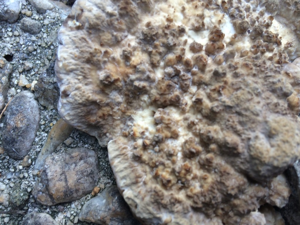 A mushroom growing in the crack of a sidewalk. Kinda looks like hot cereal with milk up close.