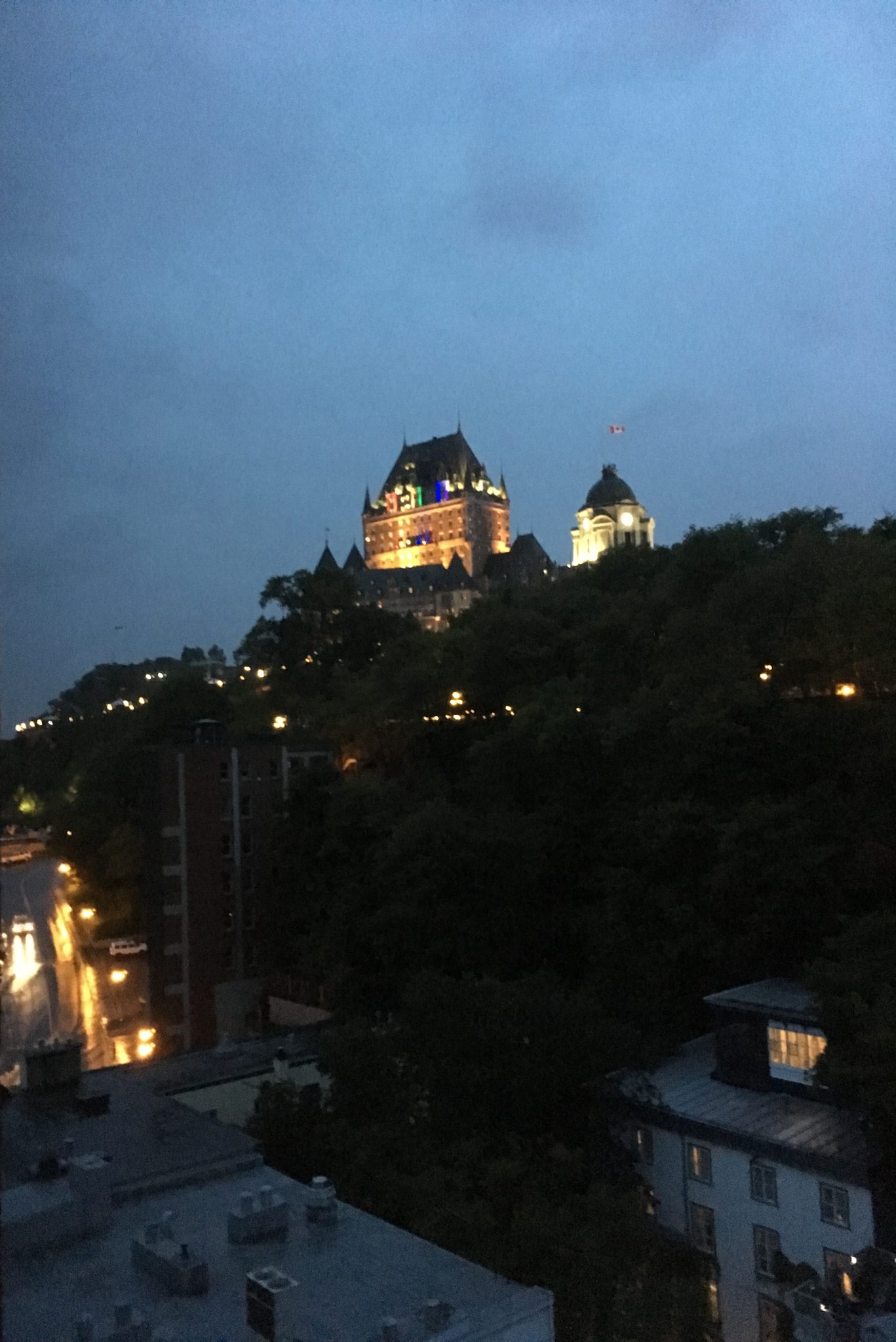 While in Québec City, I became a bit obsessed with capturing the Fairmont Le Château Frontenac from every possible angle. I was lucky to have this view from my hotel of the glow from the specially colored lights on Labor Day.